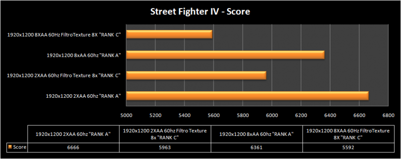 Street Fighter IV, ultimo picchiaduro della saga Street Fighter di casa Capcom, ha avuto un ottimo punteggio con il nostro sistema, che si è trovato in difficoltà solamente se viene aumentato il “Fitro texture”; le bontà prestazionali della 5750 ci hanno permesso di finire il test anche con 8x di AA con una risoluzione di 1920x1200.