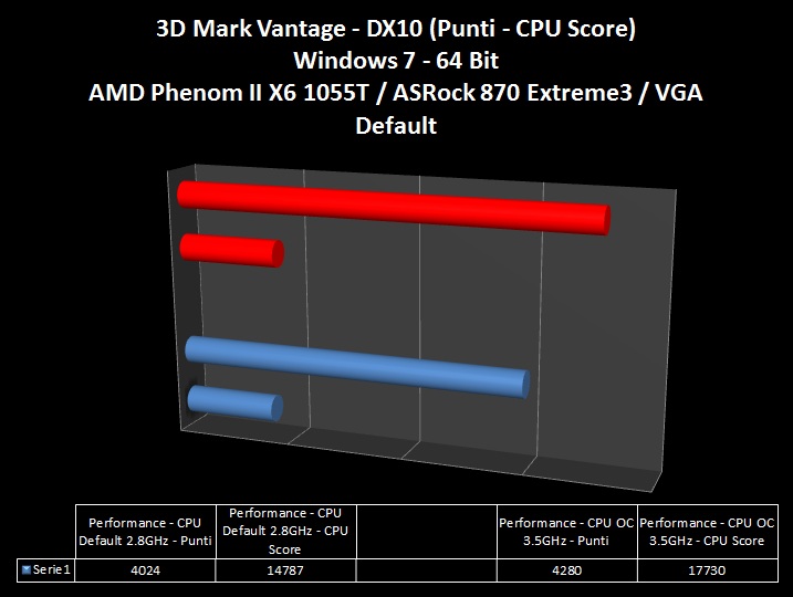 Il test è stato eseguito in modalità Performance, in DirectX 10, nel grafico il punteggio finale ottenuto e il singolo risultato riguardante la cpu.