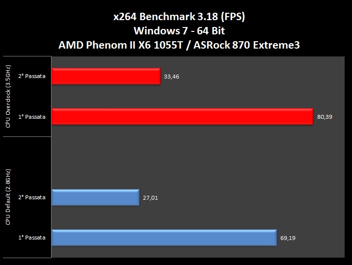 Famoso codec x264 grazie con il quale è possibile testare la potenza della propria CPU. Il benchmark risulta molto versatile per via dei risultati riproducibili ovunque grazie al file video che viene fornito oltre al software di test vero e proprio. Il suo funzionamento è basato sulla misurazione delle performance in termini di codifica video usando un filmato campione da trasformare in formato x264.